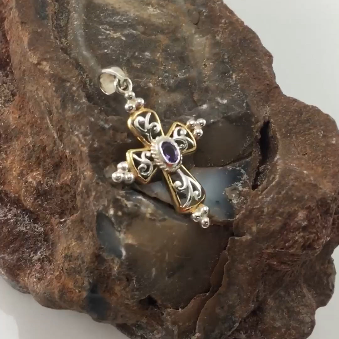 This stunning sterling silver and 18K Gold Accent Cross with Genuine Amethyst brings the beauty and grace of the meaning behind the cross for all to admire. With intricate detail and delicate gemstone placement, history and faith collide in this magnificent jewelry pendant.