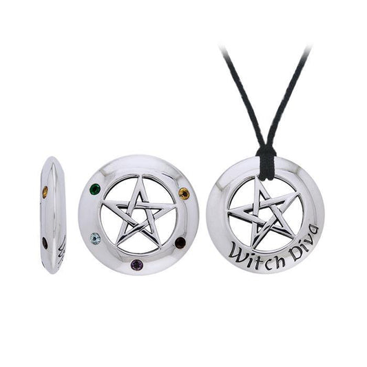 Witch Diva Pentacle with Gemstones Silver Pendant Set TSE430