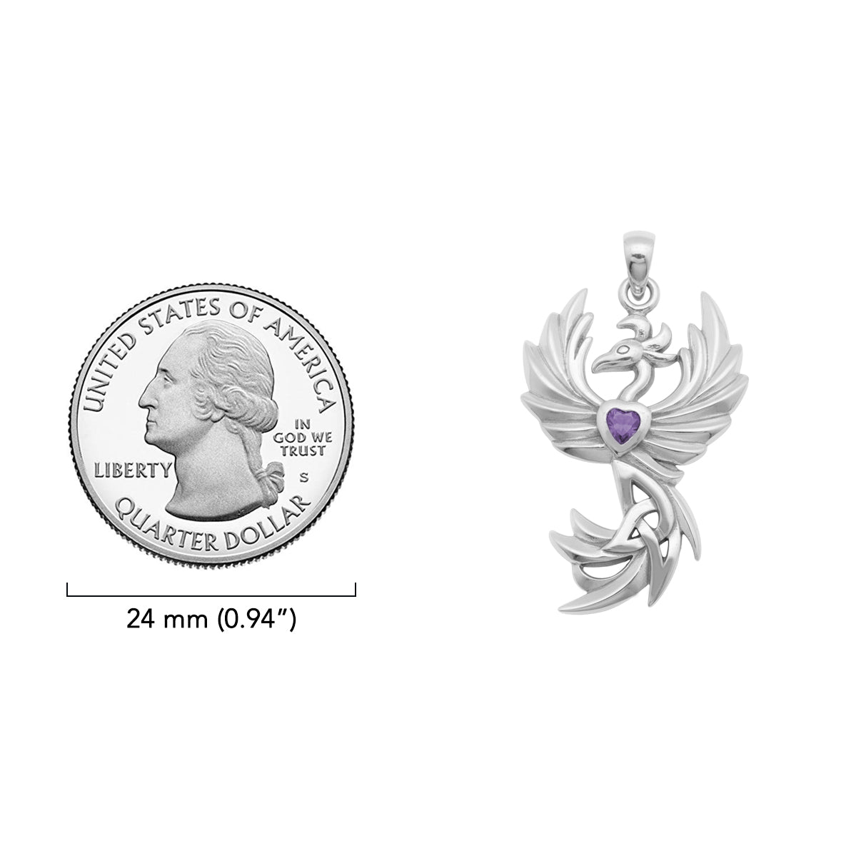 Embrace the powerful symbolism of love and rebirth with this striking Phoenix with Celtic Trinity and Heart Gemstone Sterling Silver Pendant.