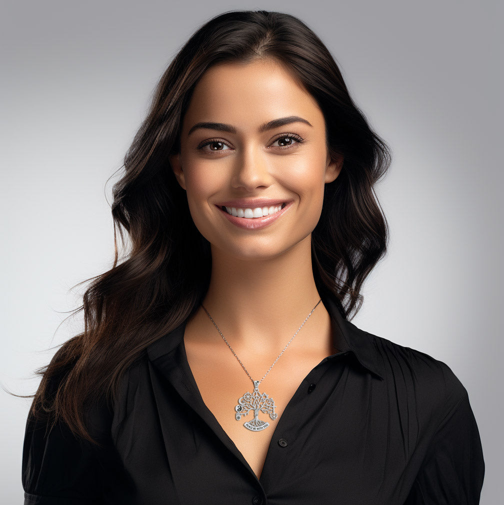 This stunning Tree of Life pendant is crafted in sterling silver, symbolizing unity, peace, and spiritual harmony. Intricately designed, the branches of the tree gracefully intertwine with universal faith symbols, including the Christian Cross, Star of David, Om, Crescent Moon and Star, Yin-Yang, Dharma Wheel, Khanda, Hamsa, and Peace Sign. Each emblem represents a belief system that promotes love, balance, and coexistence.