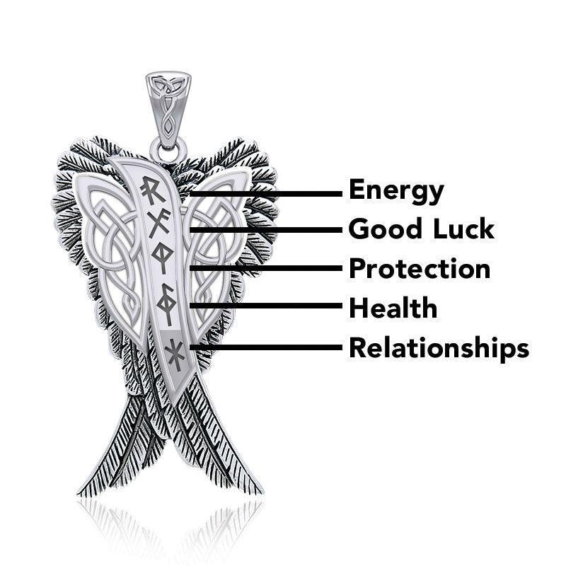 You can honor your guardian angel and the spirit that guides and protects you with these beautiful Celtic Angel Wings with Rune Symbols silver Pendant.