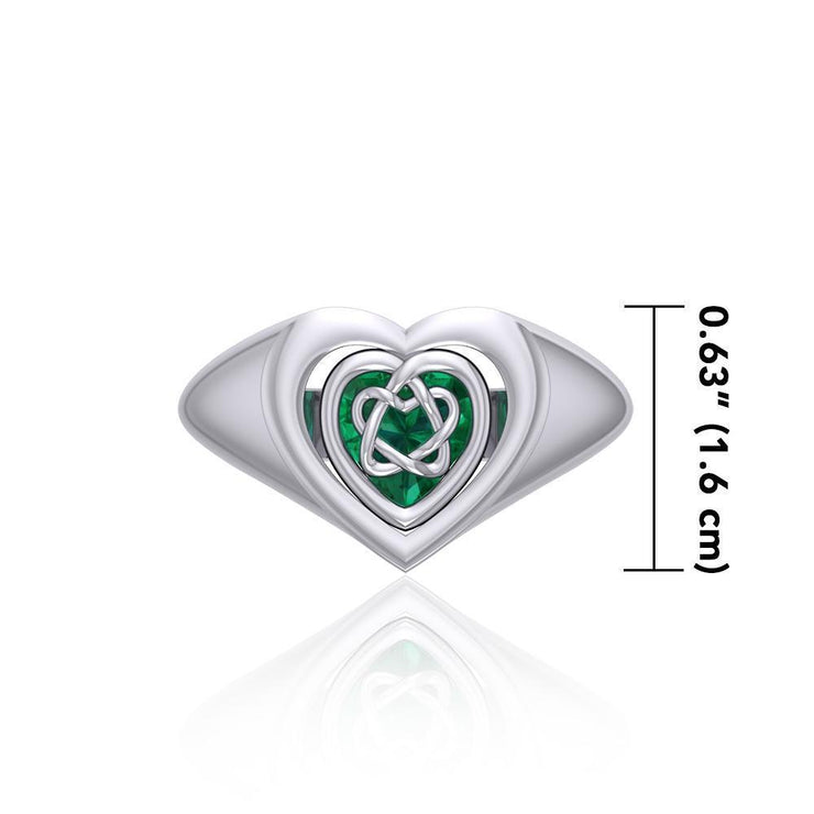 This sterling silver Flip ring by Peter Stone is embedded with shimmering emerald glass on one side, while the other side is adorned with Celtic Knotwork woven into a flower design. The emerald glass adds just a touch of color as it peeks through the Knotwork filigree.