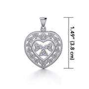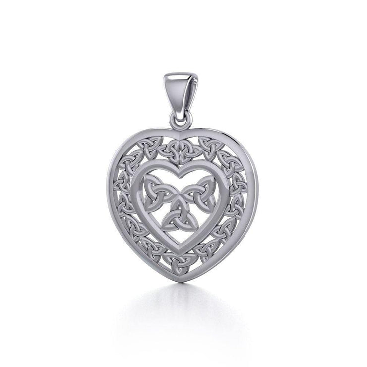 Delicate Celtic Trinity knots form a heart-shaped frame around this intricate, handcrafted, sterling silver Trinity Knot pendant.