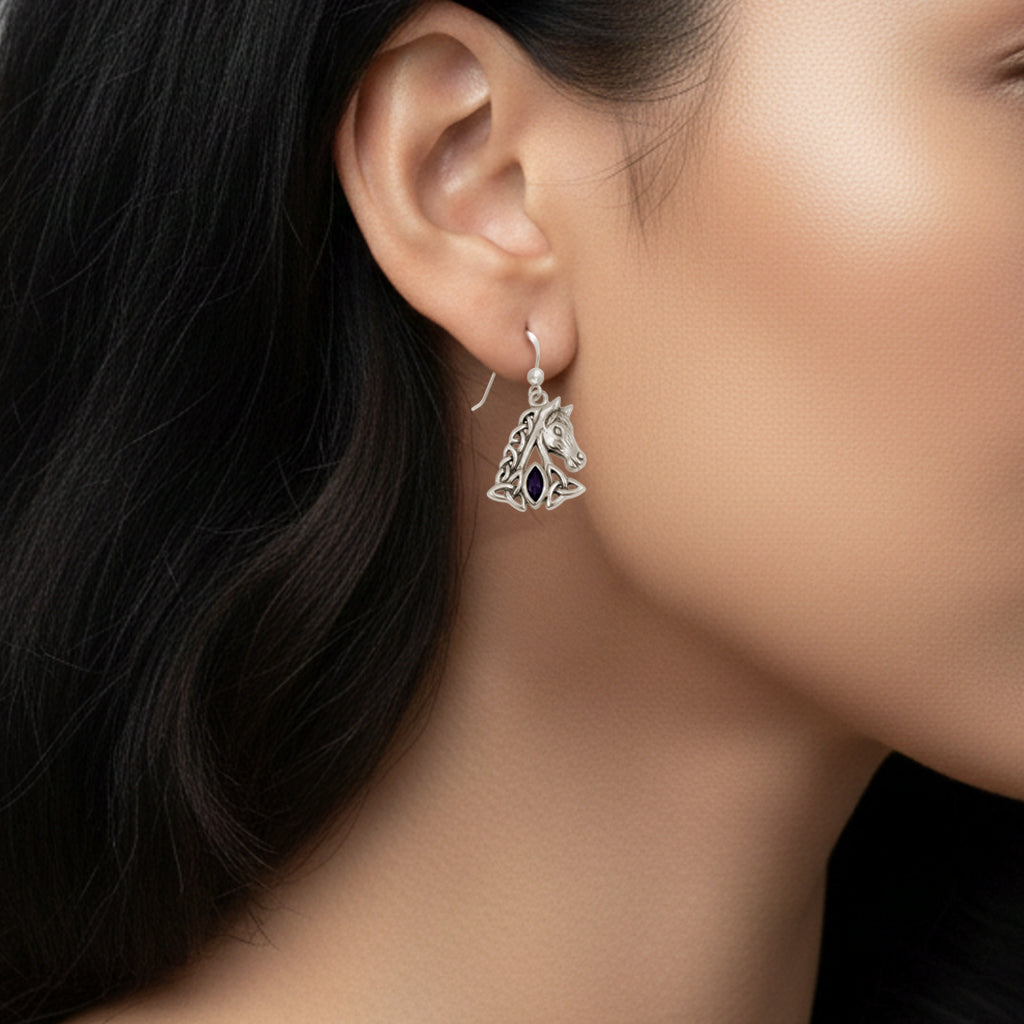 These captivating sterling silver earrings beautifully combine the power of the horse with detailed Celtic artistry. Each earring showcases a finely crafted horse's head positioned above an intricate Celtic knotwork design.
