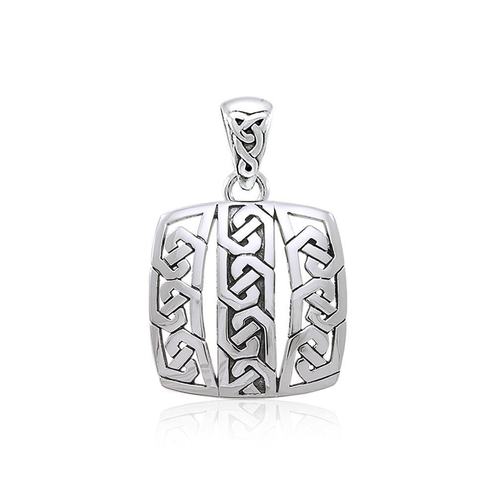 This elegant rectangular, handcrafted sterling silver pendant is composed of three bands of beautiful intricate, endless Celtic knotwork and features a Trinity Knot on the bale.