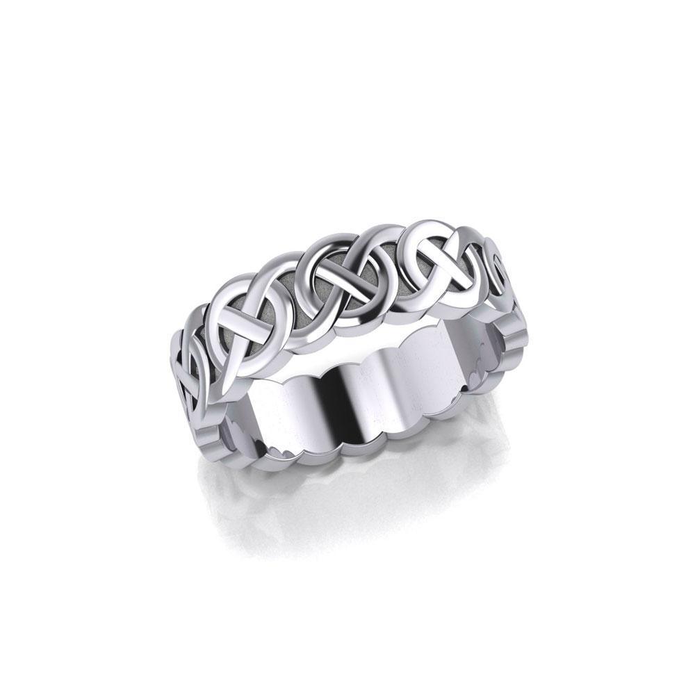 This Celtic Knotwork band in sterling silver by Peter Stone features a traditional variation of the Celtic Knot woven into an unbroken ring, signifying the power of the eternal.