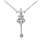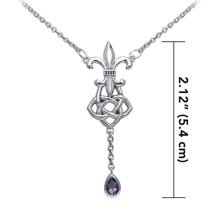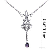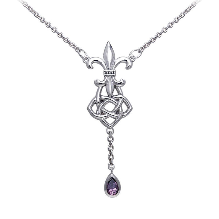Adorned with delicate Celtic Knotwork, this tantalizing Fleurdelis and Celtic Knotwork necklace with gemstone dangle in striking sterling silver by Peter Stone is clearly fit for a queen.