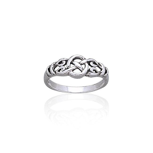 Open and closed-ended Celtic knotwork intertwines in this sterling silver ring, signifying both ongoing journeys and infinity.