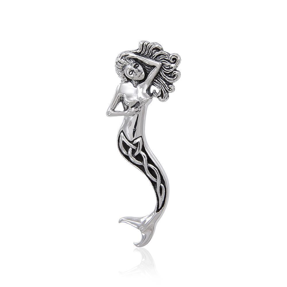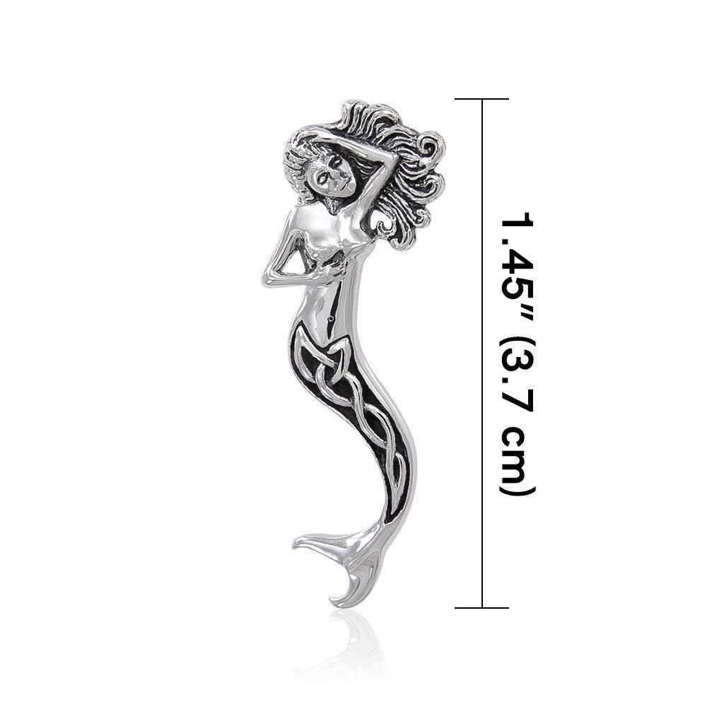 This graceful sterling silver mermaid features exquisite Celtic knot details on her tail, swimming in a display of elegance.