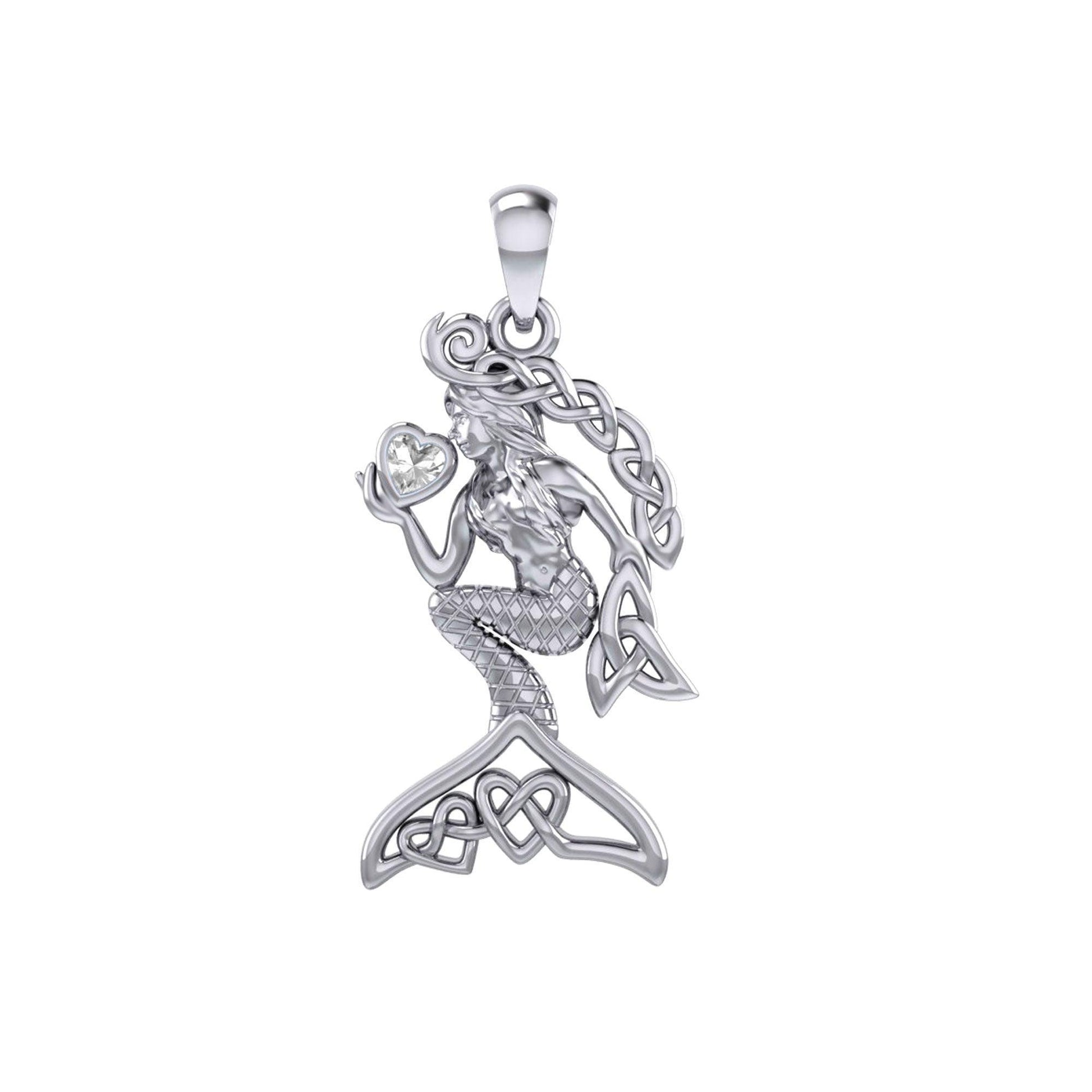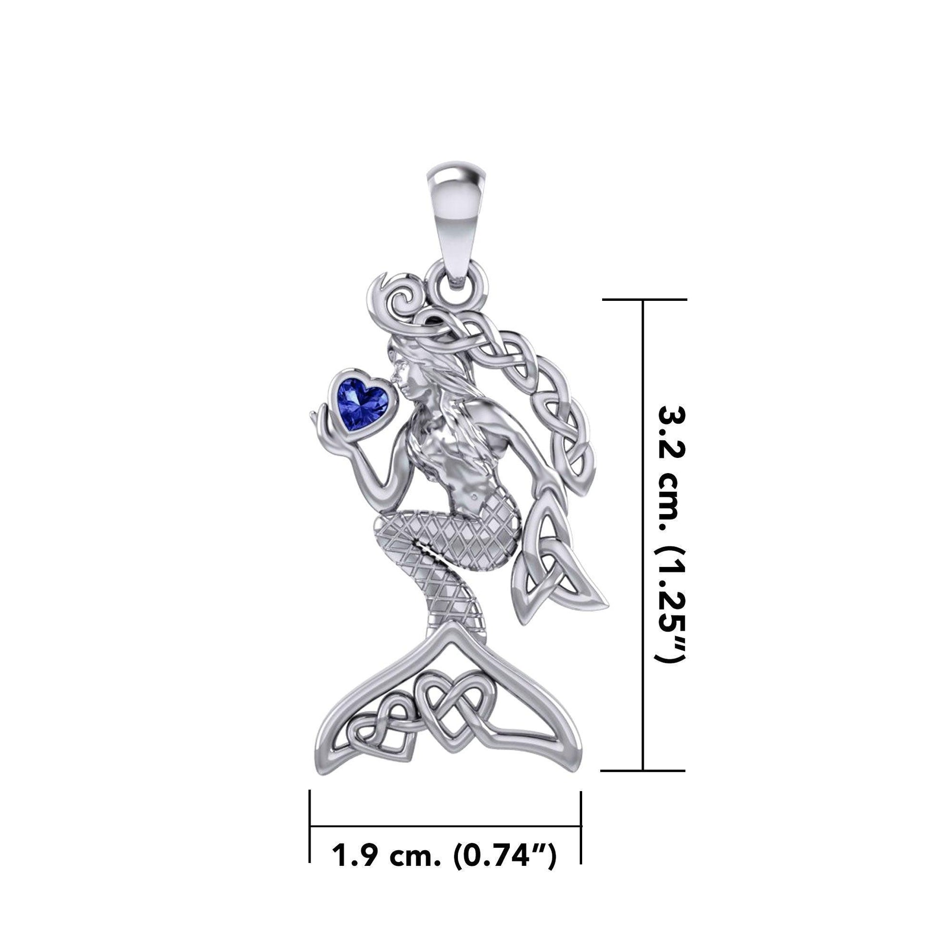 The Celtic Mermaid with Heart Gemstone Silver Pendant is a stunning piece of jewelry that features a beautifully designed mermaid with a heart-shaped gemstone accent. The pendant is crafted from high-quality sterling silver, with intricate Celtic knotwork detailing on the mermaid's tail.