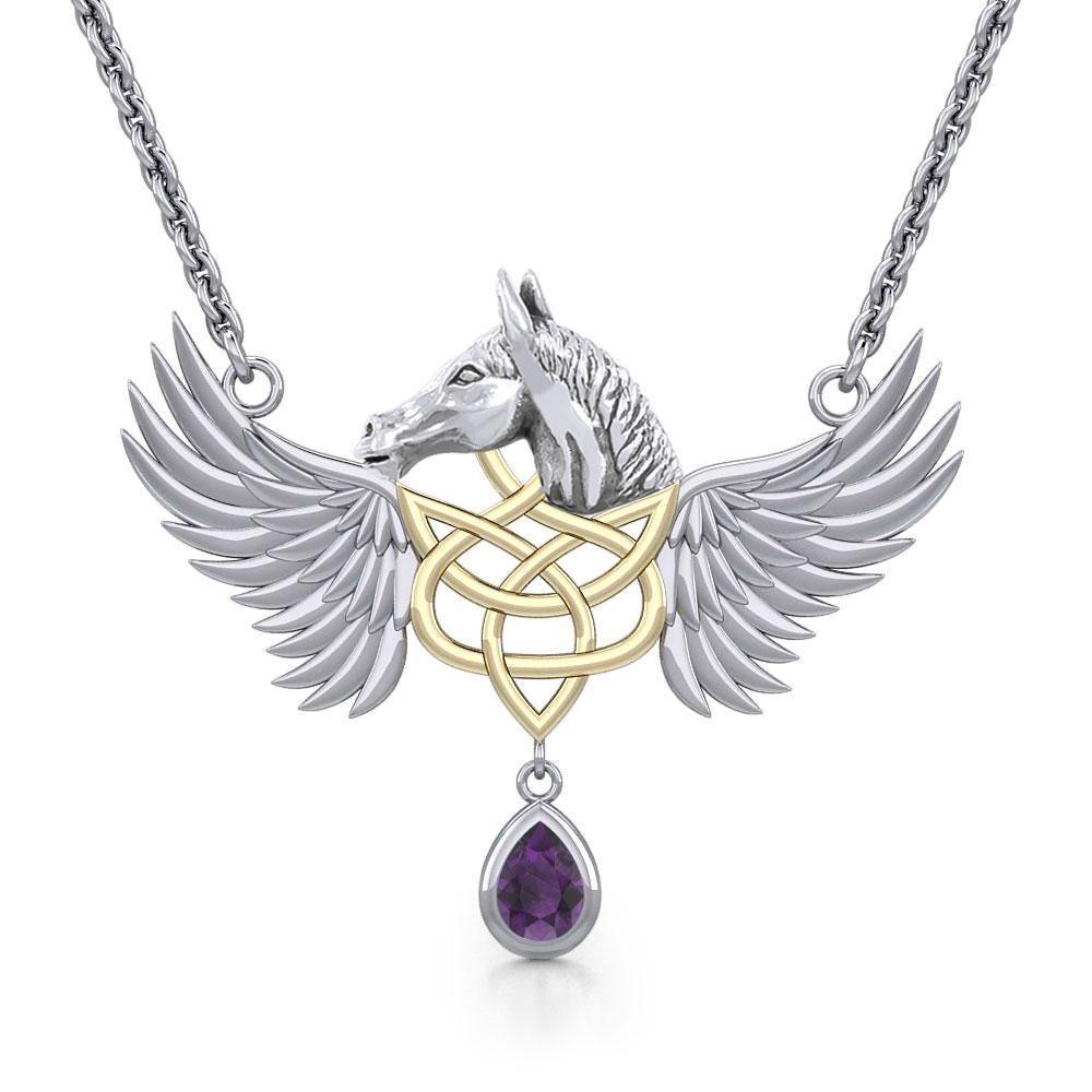 Celtic Pegasus Horse with Wing Silver and Gold Necklace MNC540