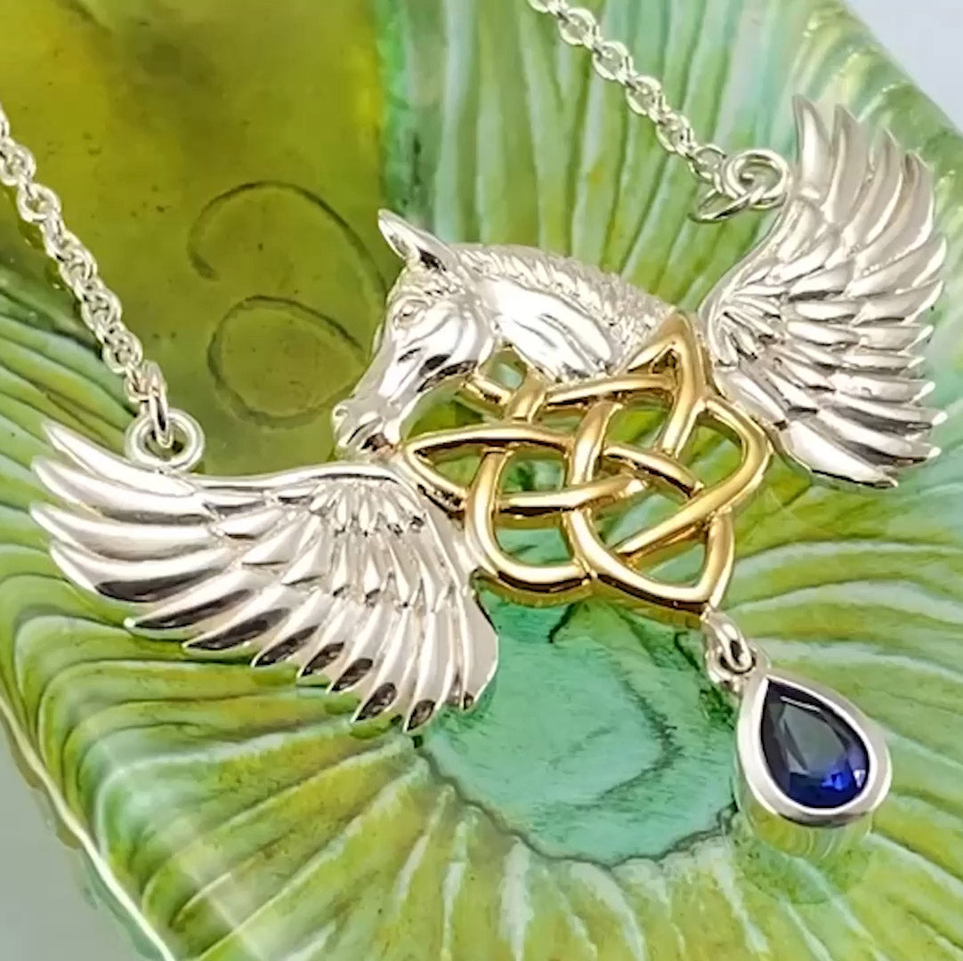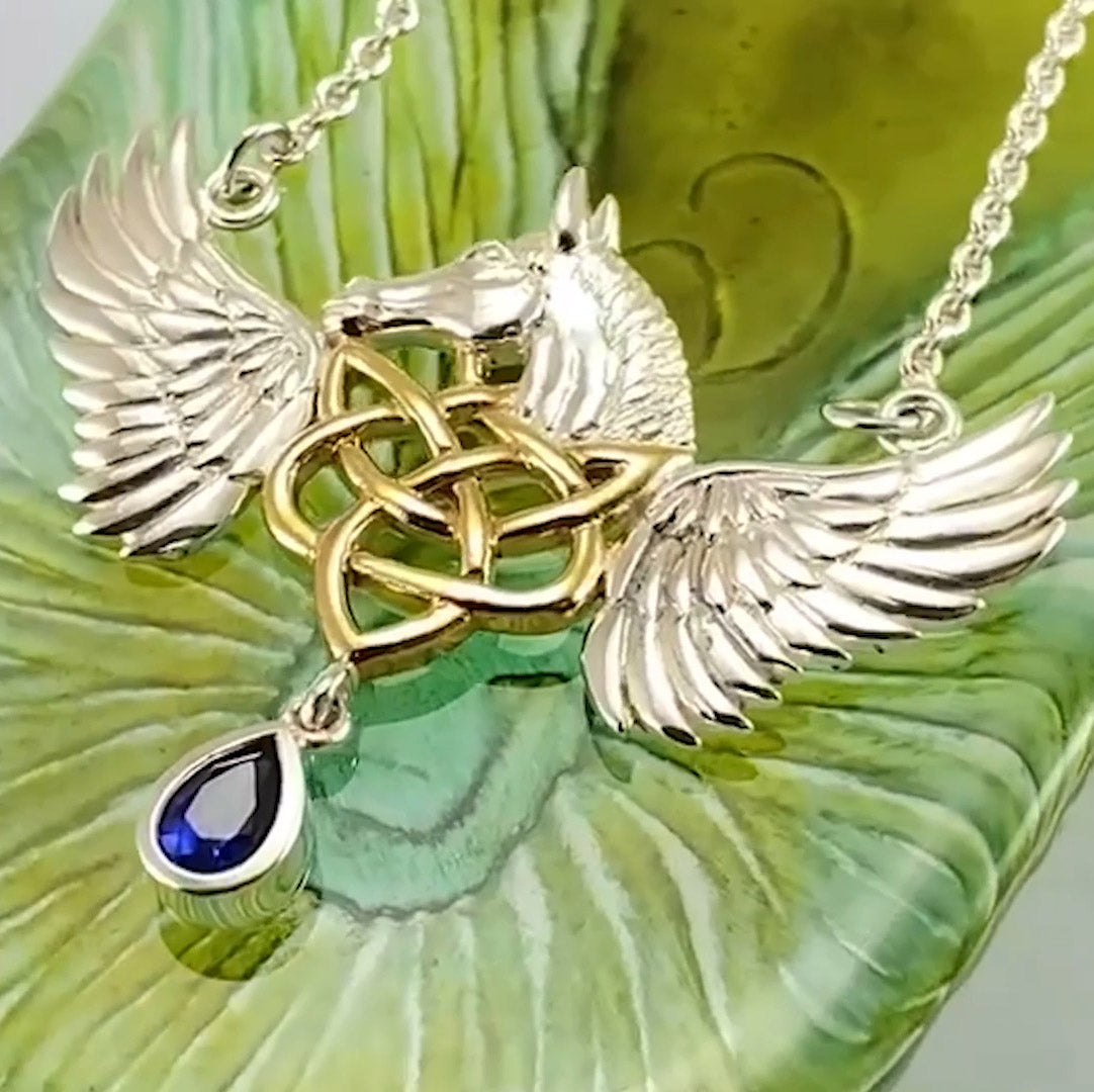 Combining the beauty of Celtic knotwork and the grace of the Pegasus, Peter Stone the world's leading manufacturer of fine sterling silver jewelry - has designed this Celtic inspired horse Necklace.