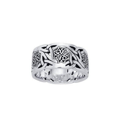 The Celtic Triquetra is a powerful statement that manifests throughout the Celtic region associated with the three elements of nature – water, earth, and air. Water depicts our emotions, air symbolizes our thoughts, and the earth is us. Peter Stone combines a simple design framed of symbolic meaning in this sterling silver ring that blends in the powerful message of Trinity and forms a star-like weave between chains of Triquetra.