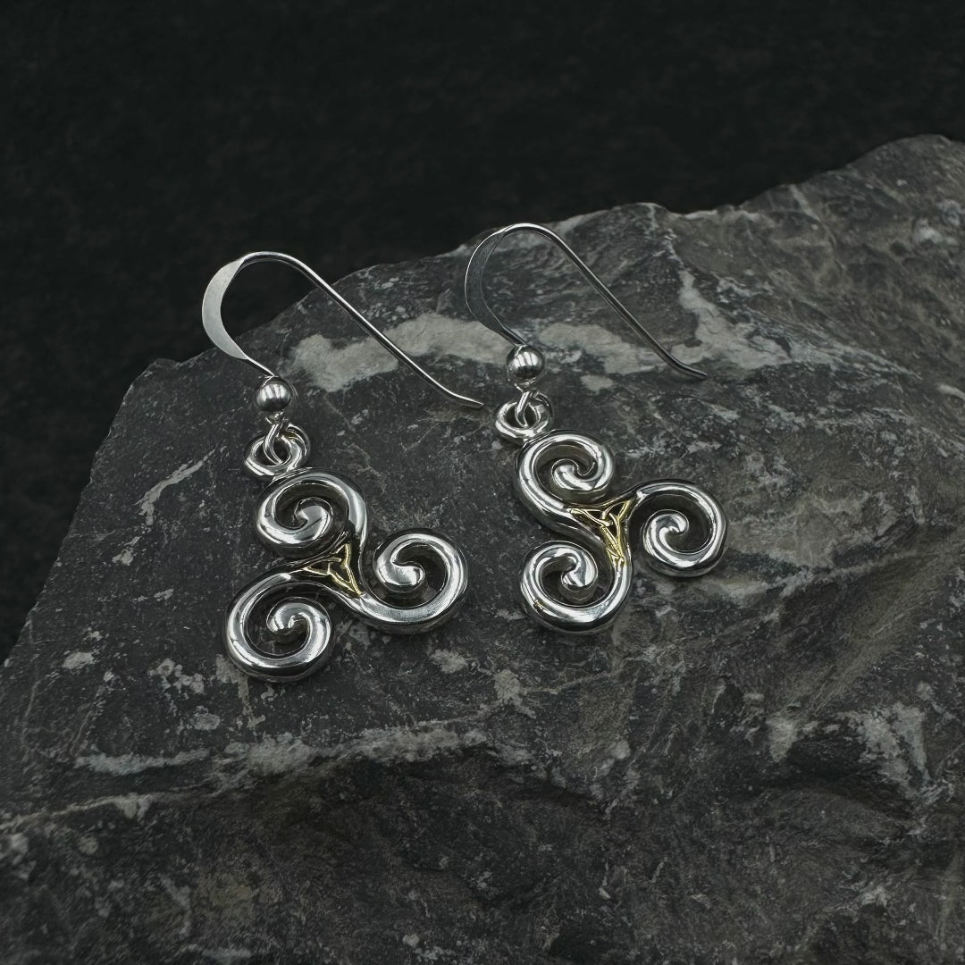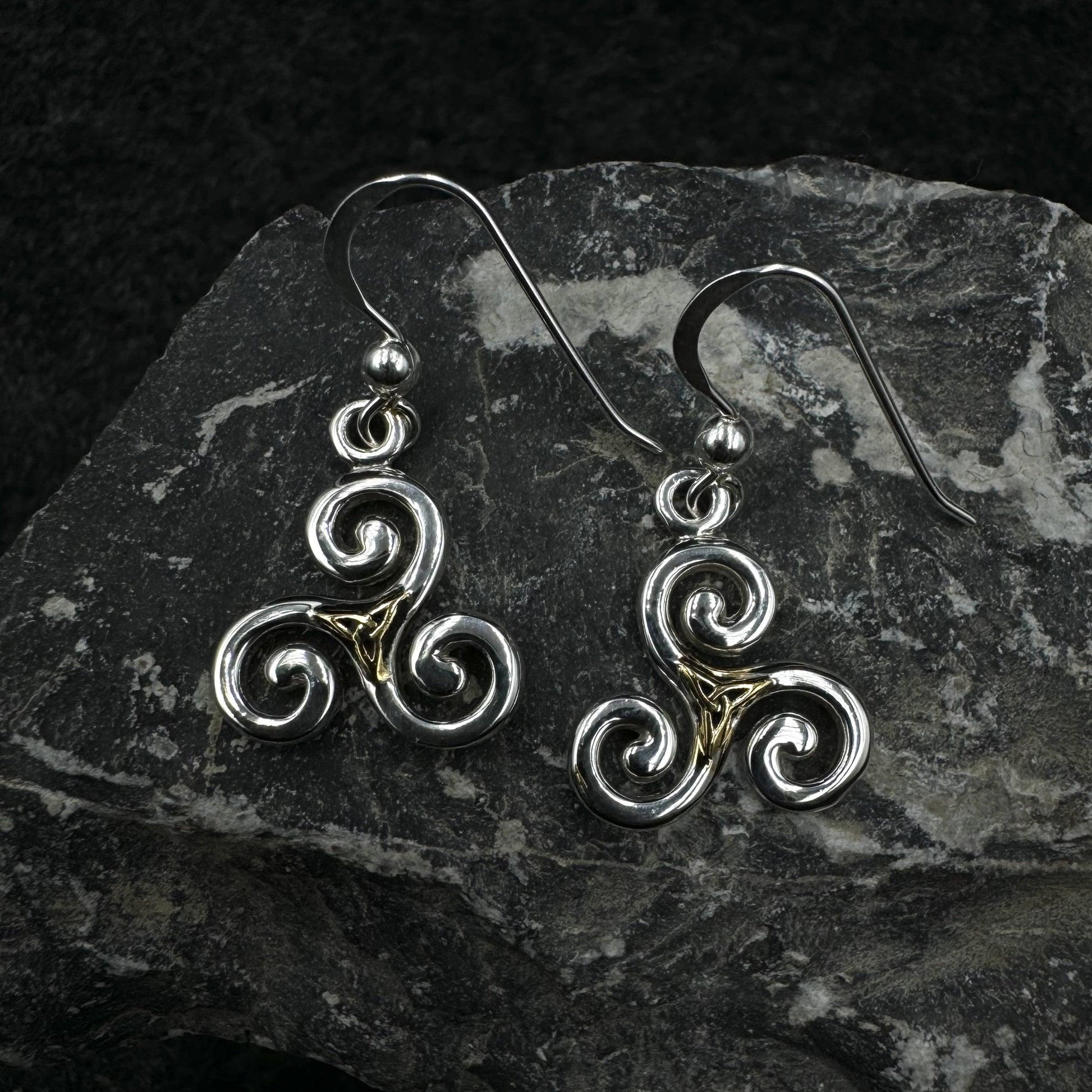 Meticulously crafted from fine sterling silver with 18 karat Gold accents, the Celtic Triskele Silver & Gold Earrings showcase the beauty of Celtic tradition, modern design, and the fine craftsmanship of Peter Stone Artisans.