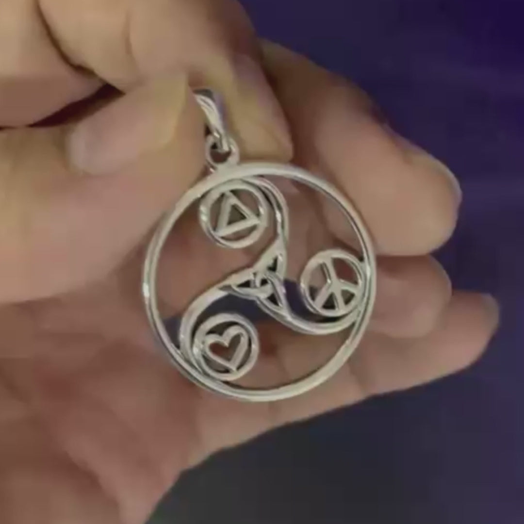 The Celtic Triskele with Peace Heart and Recovery Symbols Silver Pendant is a unique and symbolic piece of jewelry that combines several powerful elements. The pendant is made of high-quality sterling silver and features an intricate Celtic Triskele design.