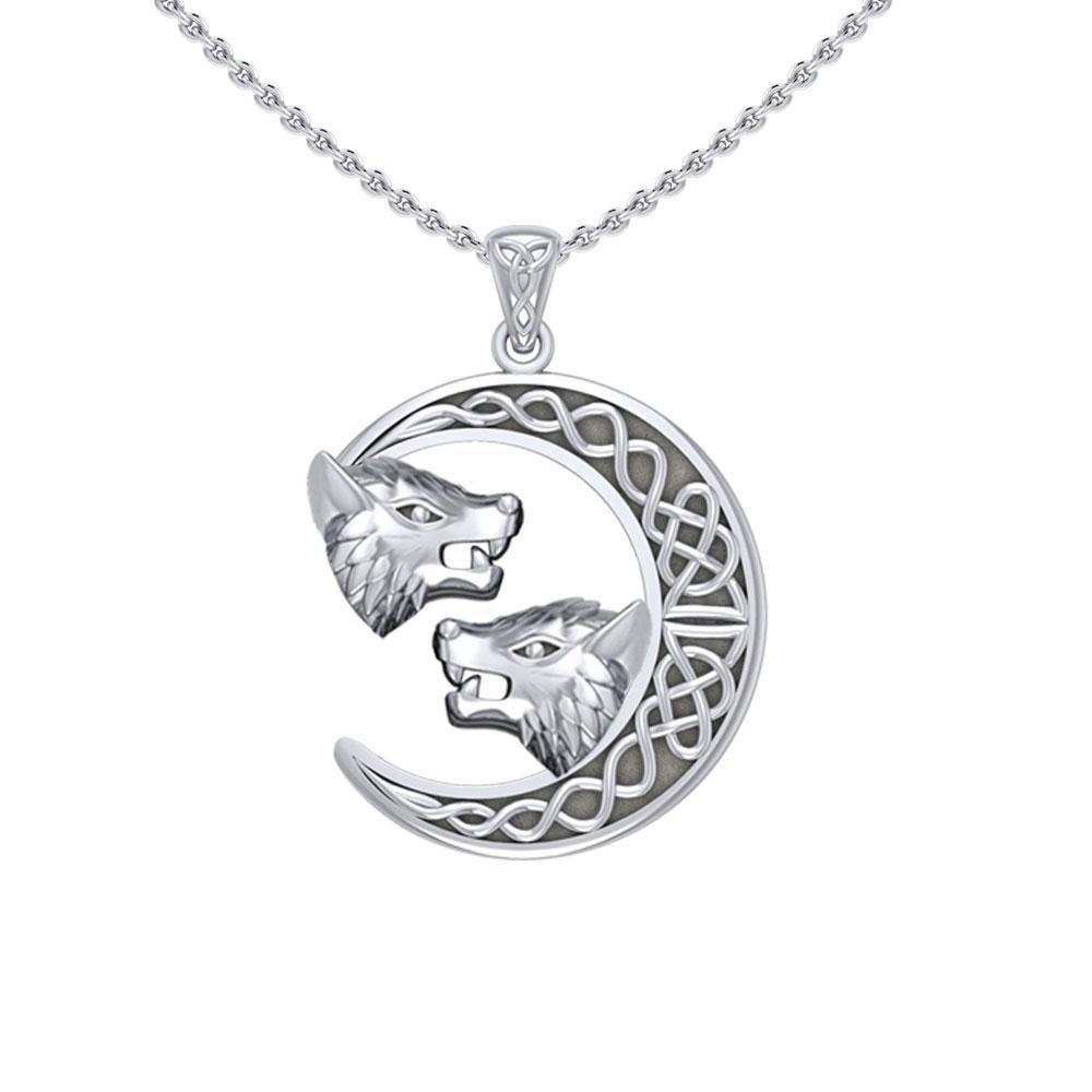 Meticulously crafted from fine silver, Double Wolf Heads with Celtic Crescent Moon Silver Pendant is a beautiful embodiment of the wolf's strength.
