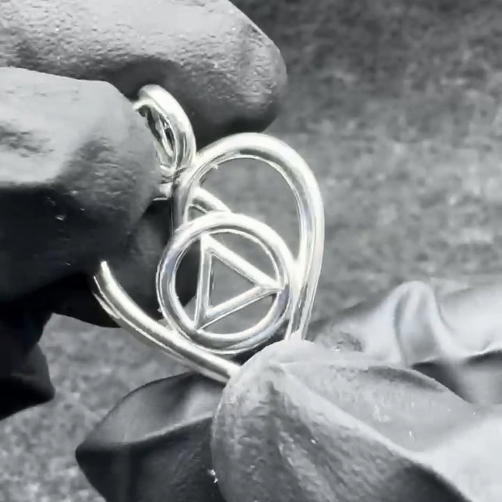 Celebrate strength, recovery, and love with this beautifully crafted Heart with AA Recovery Symbol Sterling Silver Pendant. Designed with elegance and meaning, this pendant features an open heart, symbolizing love, unity, and compassion. At its center lies the Alcoholics Anonymous (AA) Recovery Symbol—a circle enclosing a triangle, representing the Three Legacies of AA: Unity, Service, and Recovery.