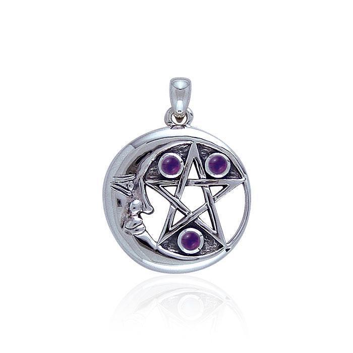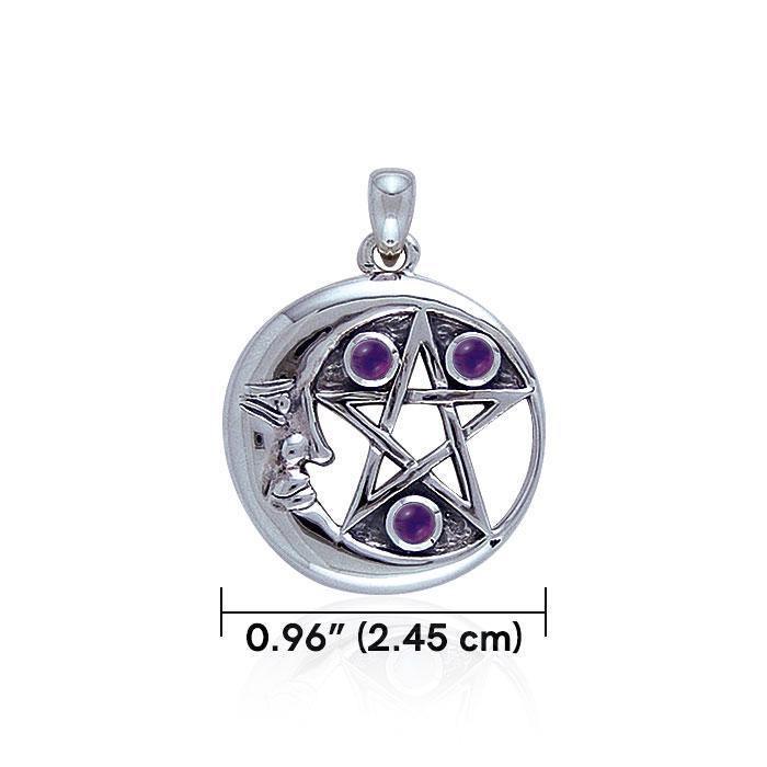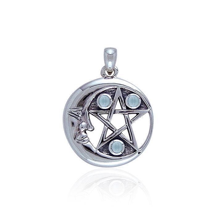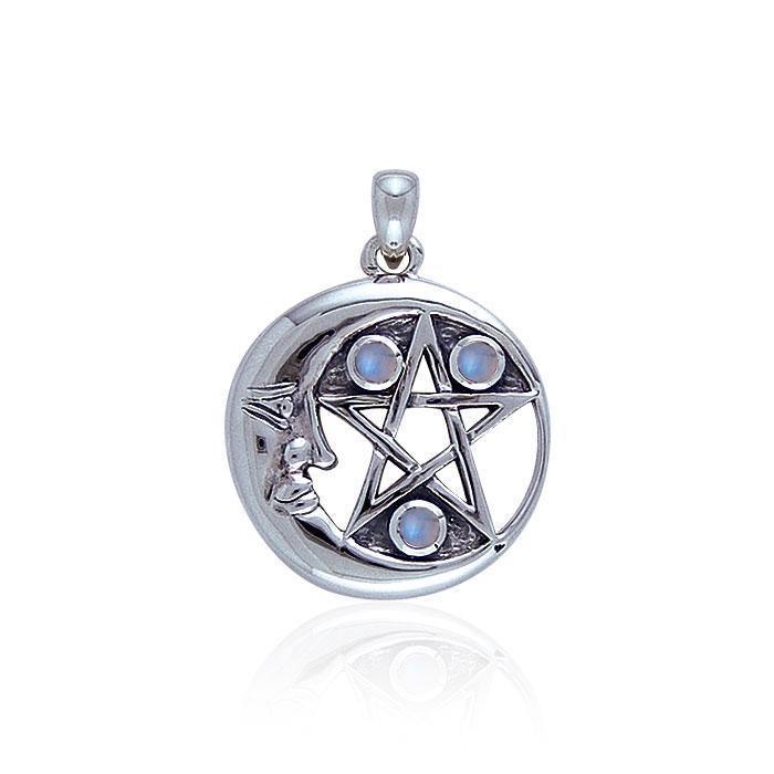 Crescent Moon Face And Pentacle Sterling Silver Pendant TP3143