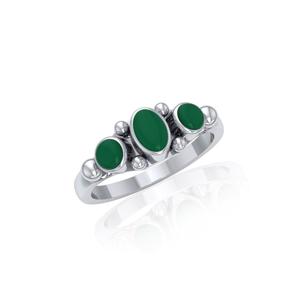 Three Synthetic Malachite gemstones adorn the head of this sterling silver ring for a simple, elegant healing and protective talisman.
