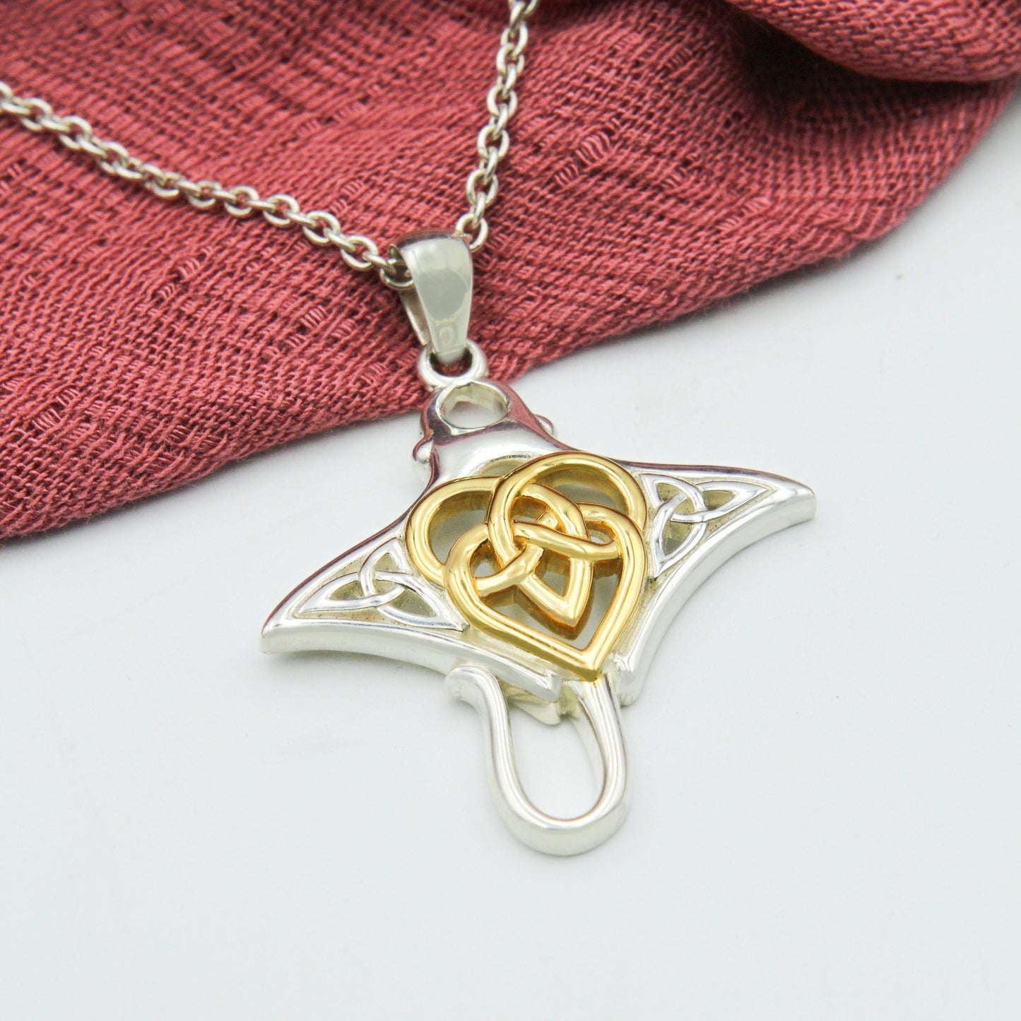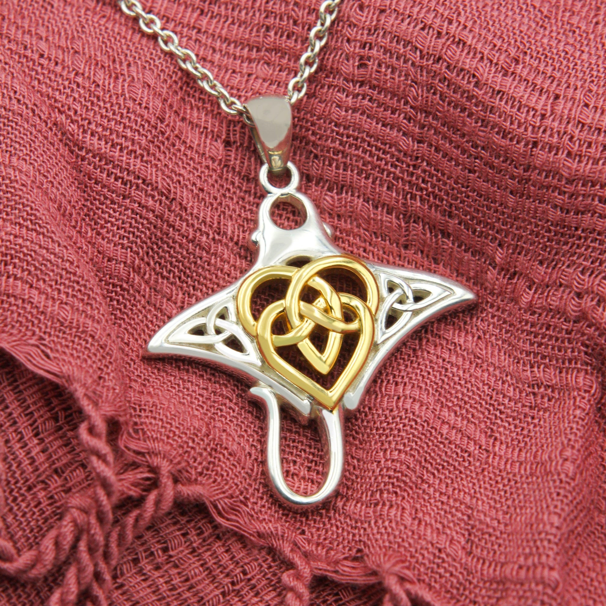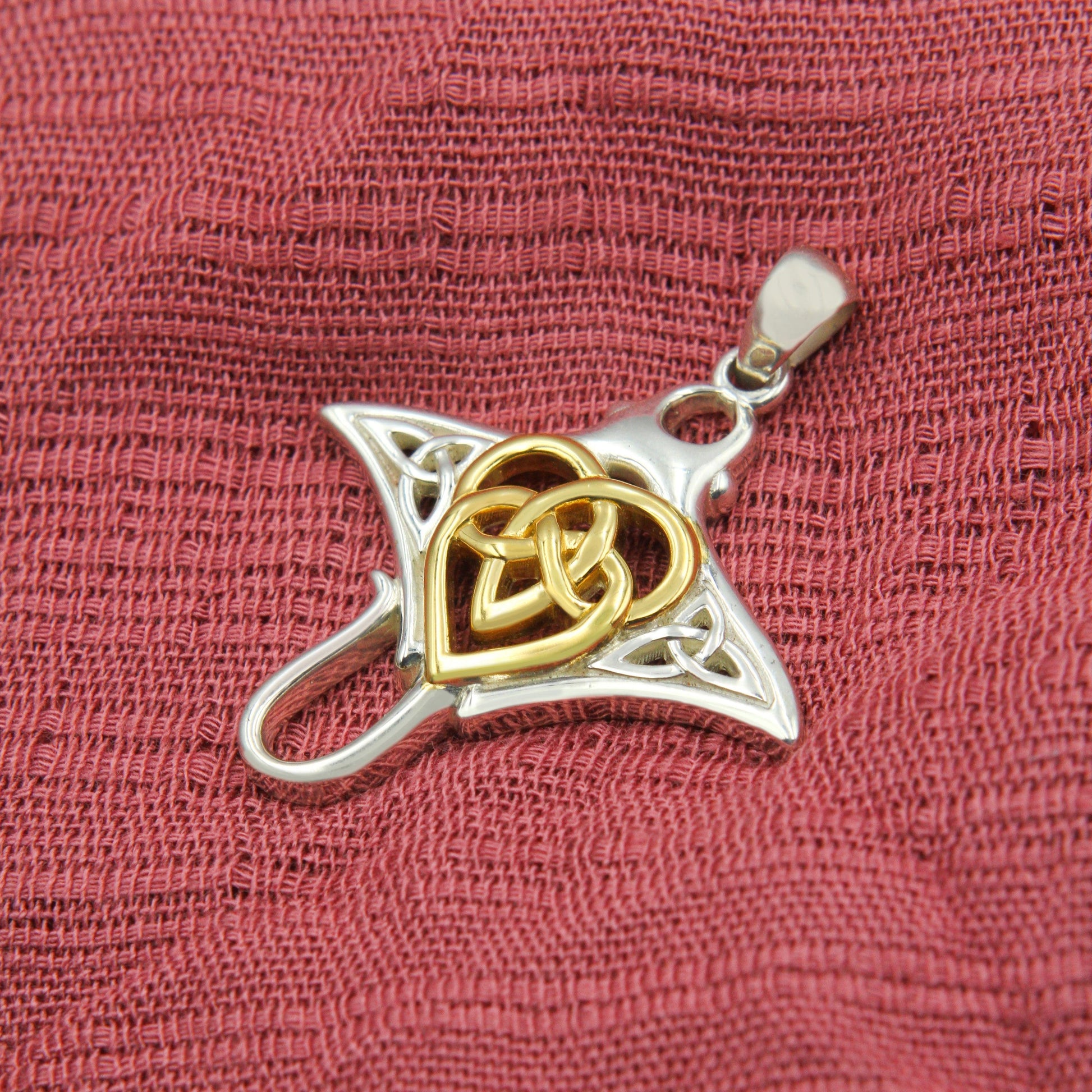 The Manta Ray with Celtic Heart in the center Silver Pendant is a piece of jewelry that features a silver pendant with a design that incorporates a Manta Ray and a Celtic heart in the center.