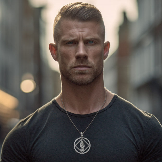 The NA Recovery Symbol with Christogram Sterling Silver Pendant is a powerful emblem of strength, faith, and transformation for individuals in recovery. This pendant showcases the Narcotics Anonymous (NA) Recovery Symbol, consisting of a diamond within a circle, symbolizing universal integrity and the four guiding principles of self, God, society, and service.