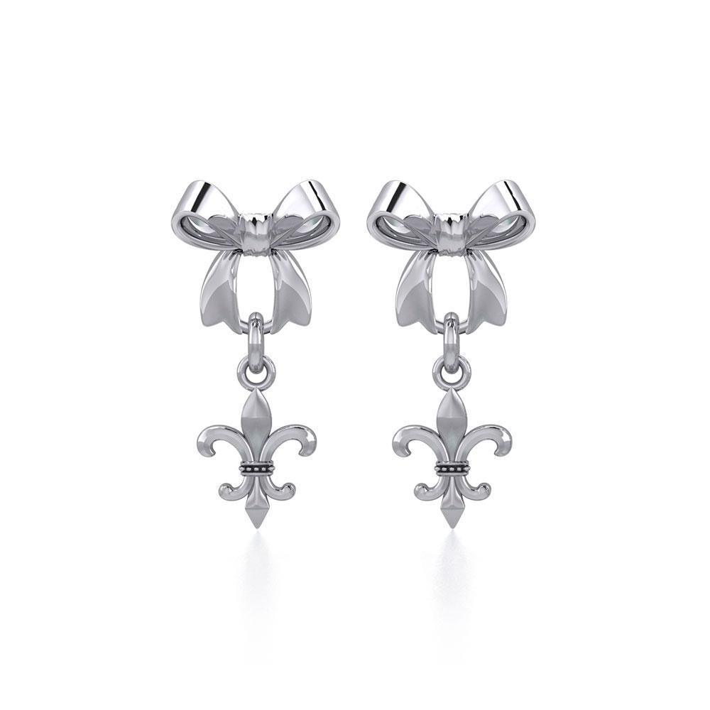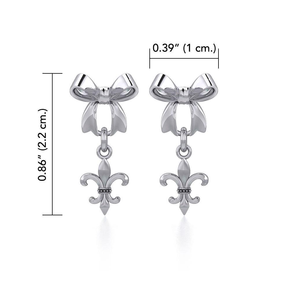 Ribbon with Dangling Fleur De Lis Silver Post Earrings TER1868