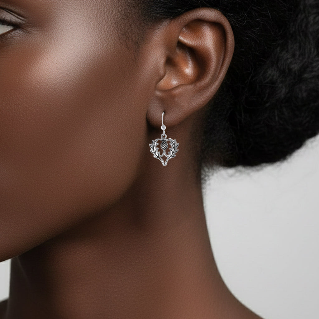Throughout Celtic regions, thistle represents bravery, devotion, durability, strength, and determination celebrated in this sterling silver hook earrings of Peter Stone Jewelry. Peter Stone honors the sacred place the thistle affirms in Celtic traditions and its strong recognition all over the world. The Scottish thistle became a national symbol, giving the motto "Nemo me impune lacessit", which is translated as "What dares meddle with me?"