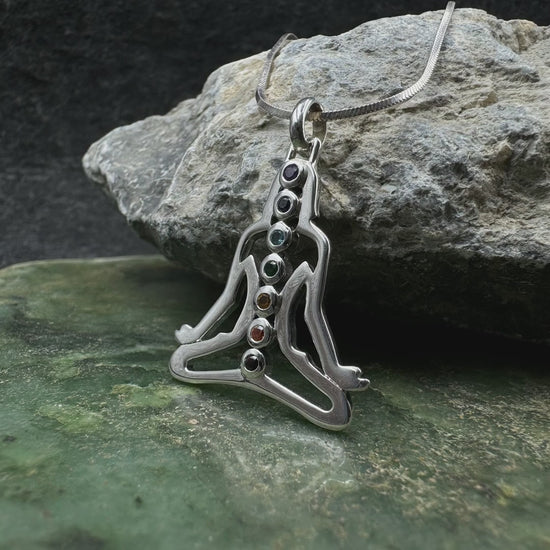 One of our most popular items, this Chakra pendant is radiant with the energy of the Chakra centers! A mixture of semiprecious and simulated stones, the light energy going up the woman's body is explosive! The wearer will, surely, feel more energized.