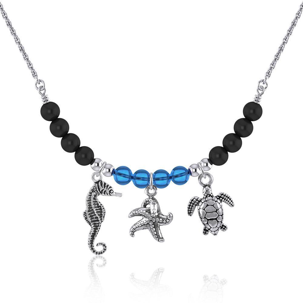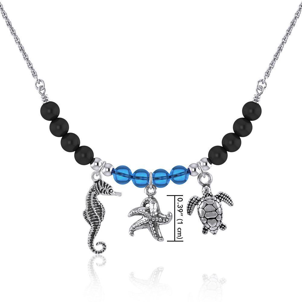 Silver Seahorse Starfish and Turtles Silver Bead Necklace TNC479