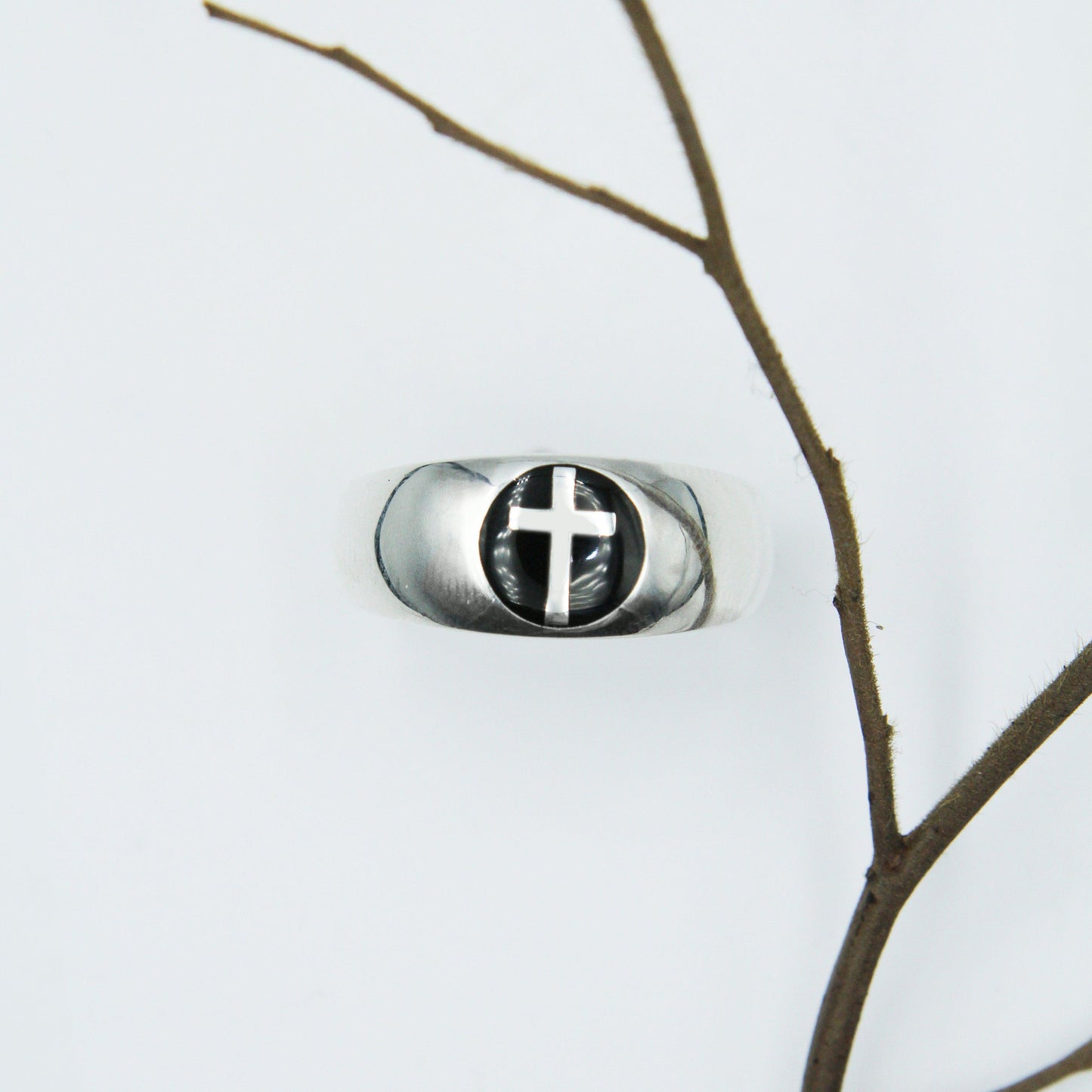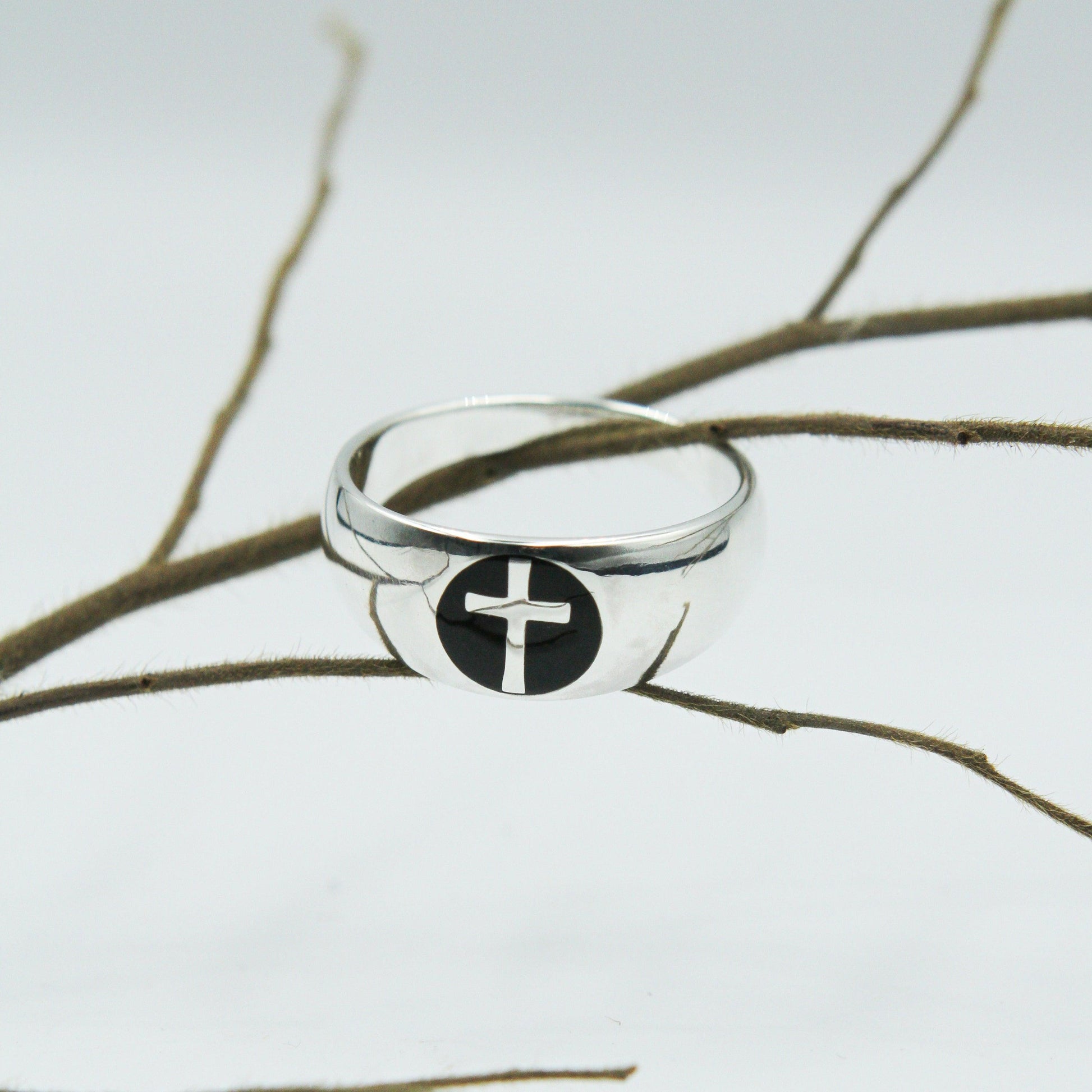 Reflecting Peter Stone Jewelry's dedication to quality craftsmanship and meaningful symbolism, this ring is a powerful expression of faith and style. Adorn your finger with this timeless piece as a statement of your spiritual journey, capturing the essence of elegance with a touch of modern masculinity. Elevate your accessory collection with the profound beauty of the Sterling Silver Faith Cross Men's Band Ring by Peter Stone Jewelry.