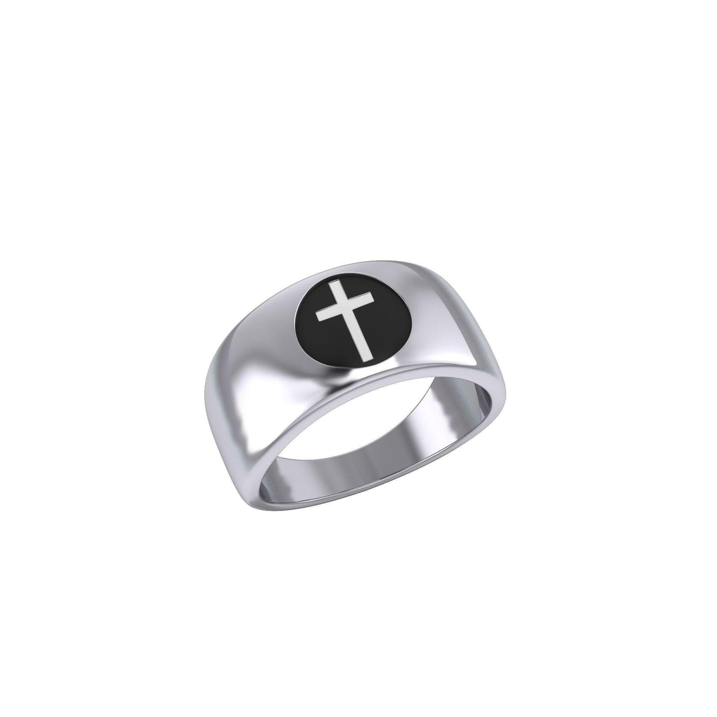 Spiritual Elegance Sterling Silver Faith Cross Men Band Ring with Black Accent by Peter Stone Jewelry TRI2475