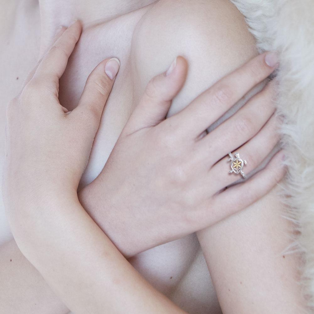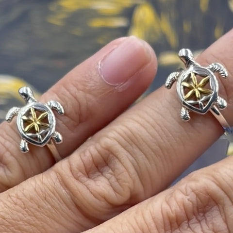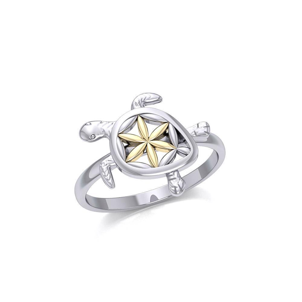 Swimming Turtle with Flower of Life Shell Silver and Gold Ring MRI1895