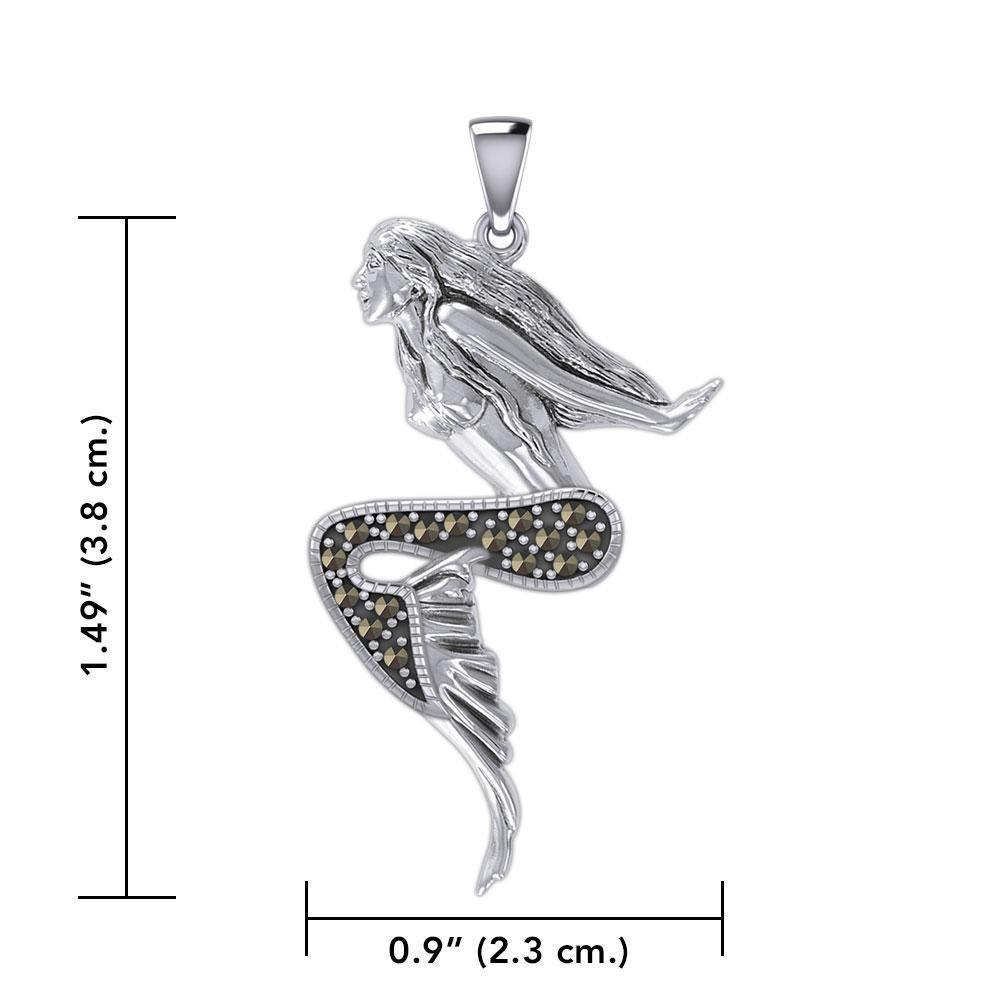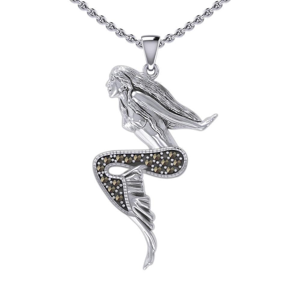 Meticulously crafted from fine sterling silver, The Goddess Mermaid Silver Pendant with Marcasite beautifully captures the spirit of the mermaid in this memorable scene.