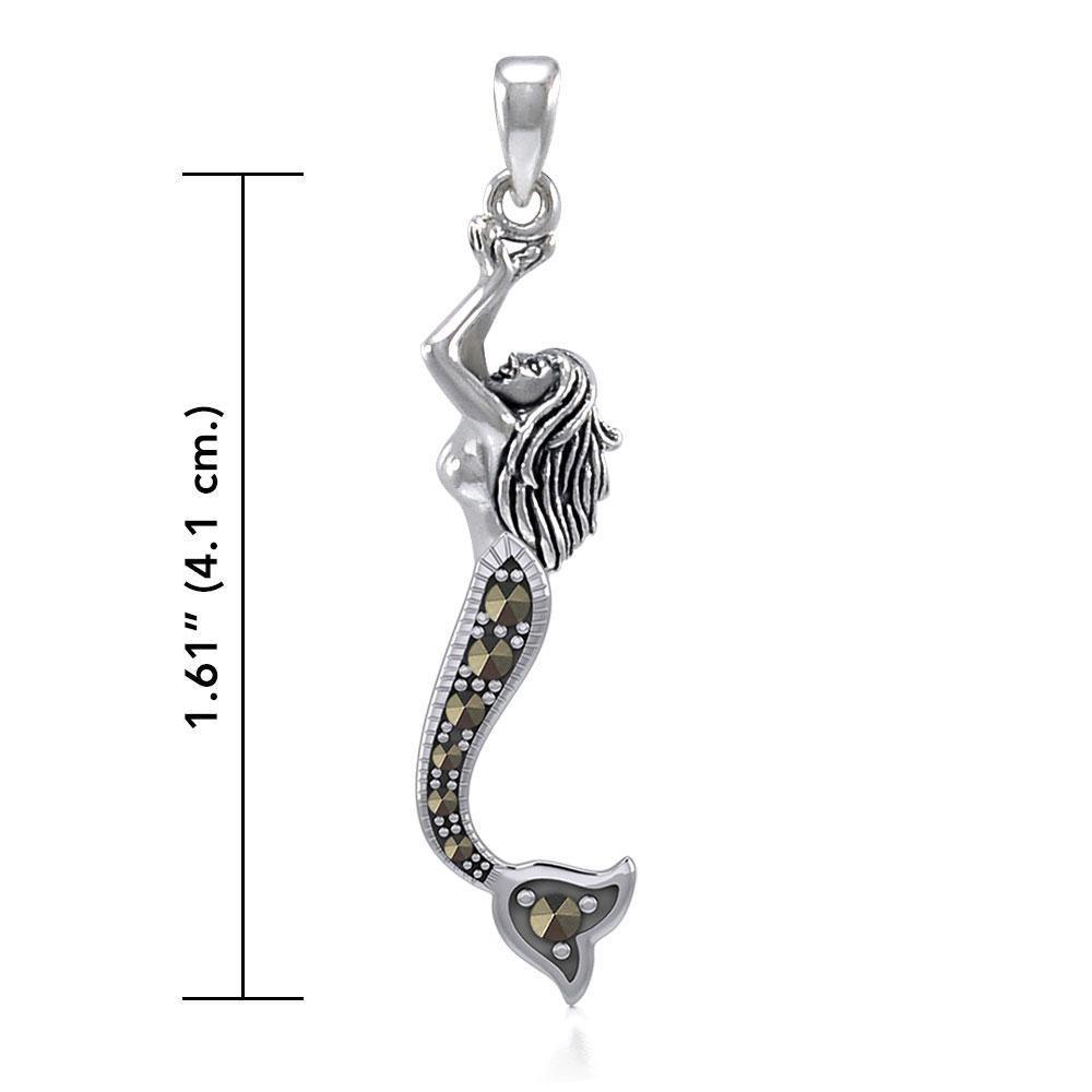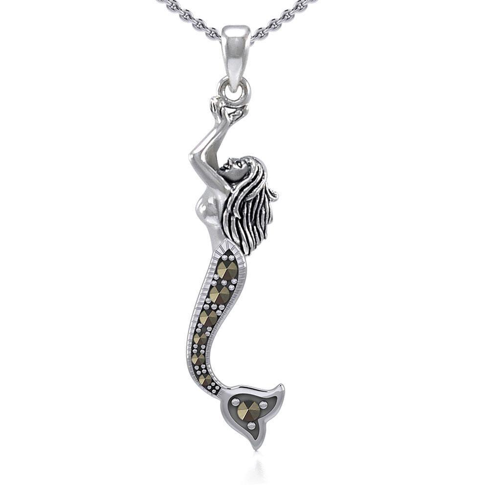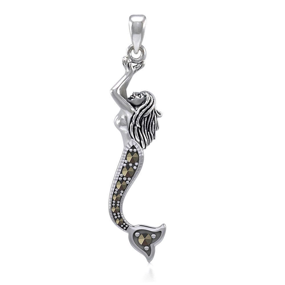 Meticulously crafted from fine sterling silver, The Goddess Mermaid Silver Pendant with Marcasite beautifully captures the spirit of the mermaid in this memorable scene.